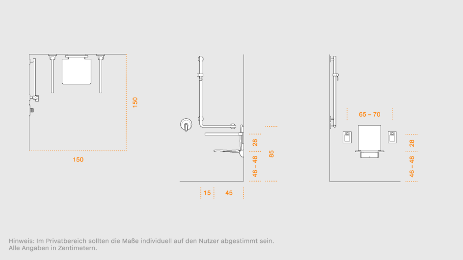 Neben der Planung von Grundfläche und Bewegungsräumen ist die Auswahl der passenden Ausstattung entscheidend für Funktionalität und NutzerInnenkomfort. Dazu zählen insbesondere Duschabtrennungen, Brausestangen, Haltegriffe und Sitzmöglichkeiten: