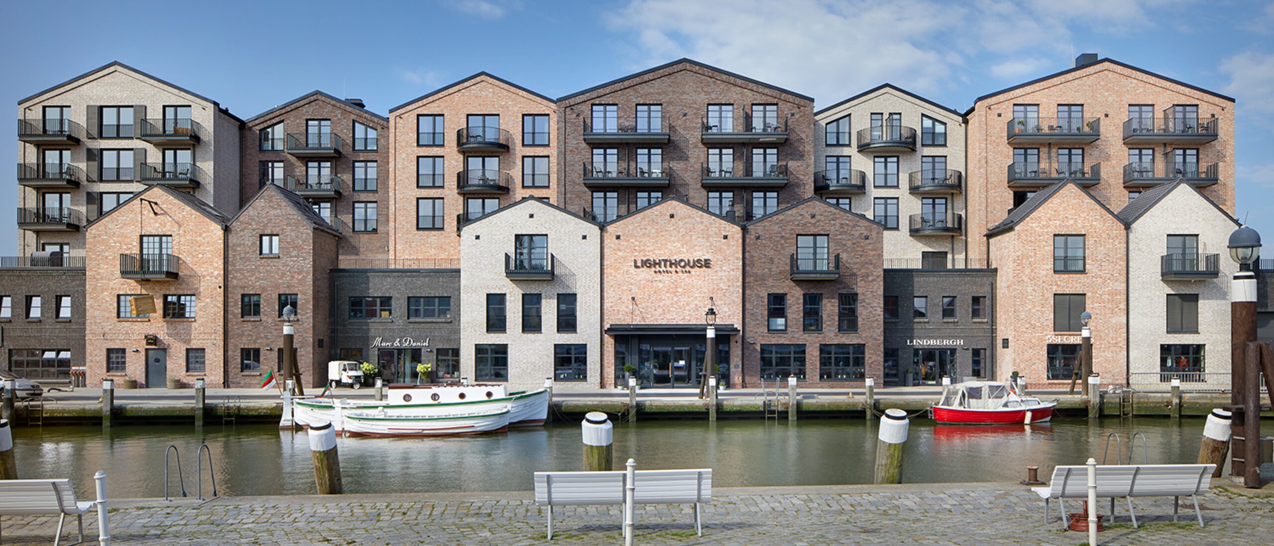 The large building volume was divided into small individual structures and conveys a typical North German harbour charm. To the observer, the Lighthouse Hotel & Spa thus looks like an ensemble of different buildings which, in addition to the hotel, also houses three restaurants, conference rooms, a delicatessen, two shops and a harbour pub.