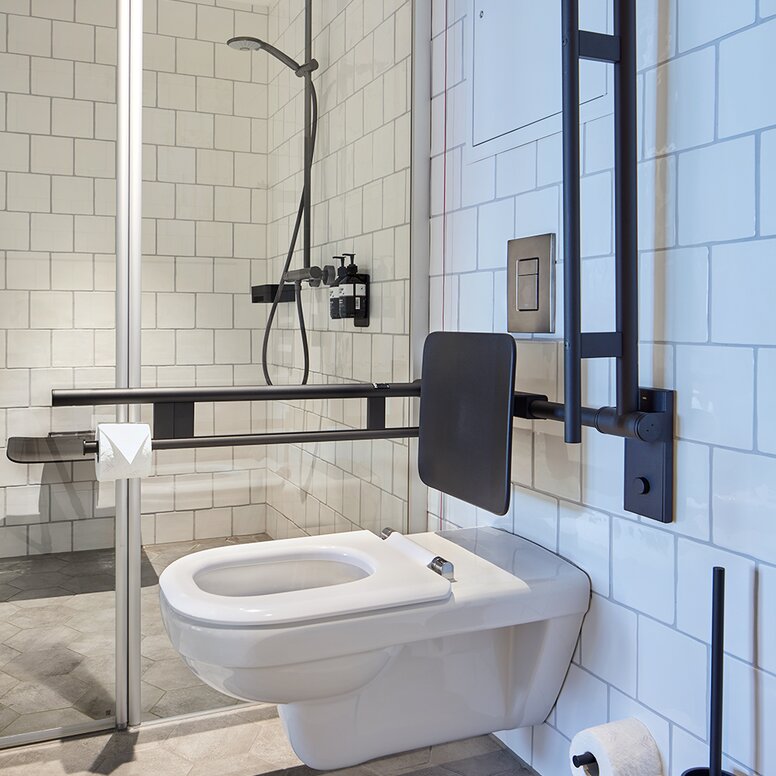 Black building and design elements run like a red thread through the design of the hotel. HEWI System 900 solutions integrate harmoniously into hotel bathrooms and accessible sanitary rooms.