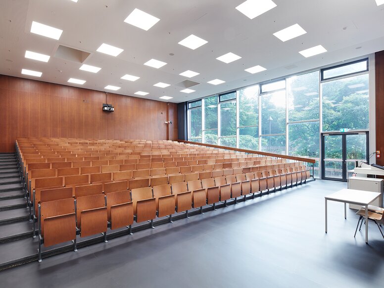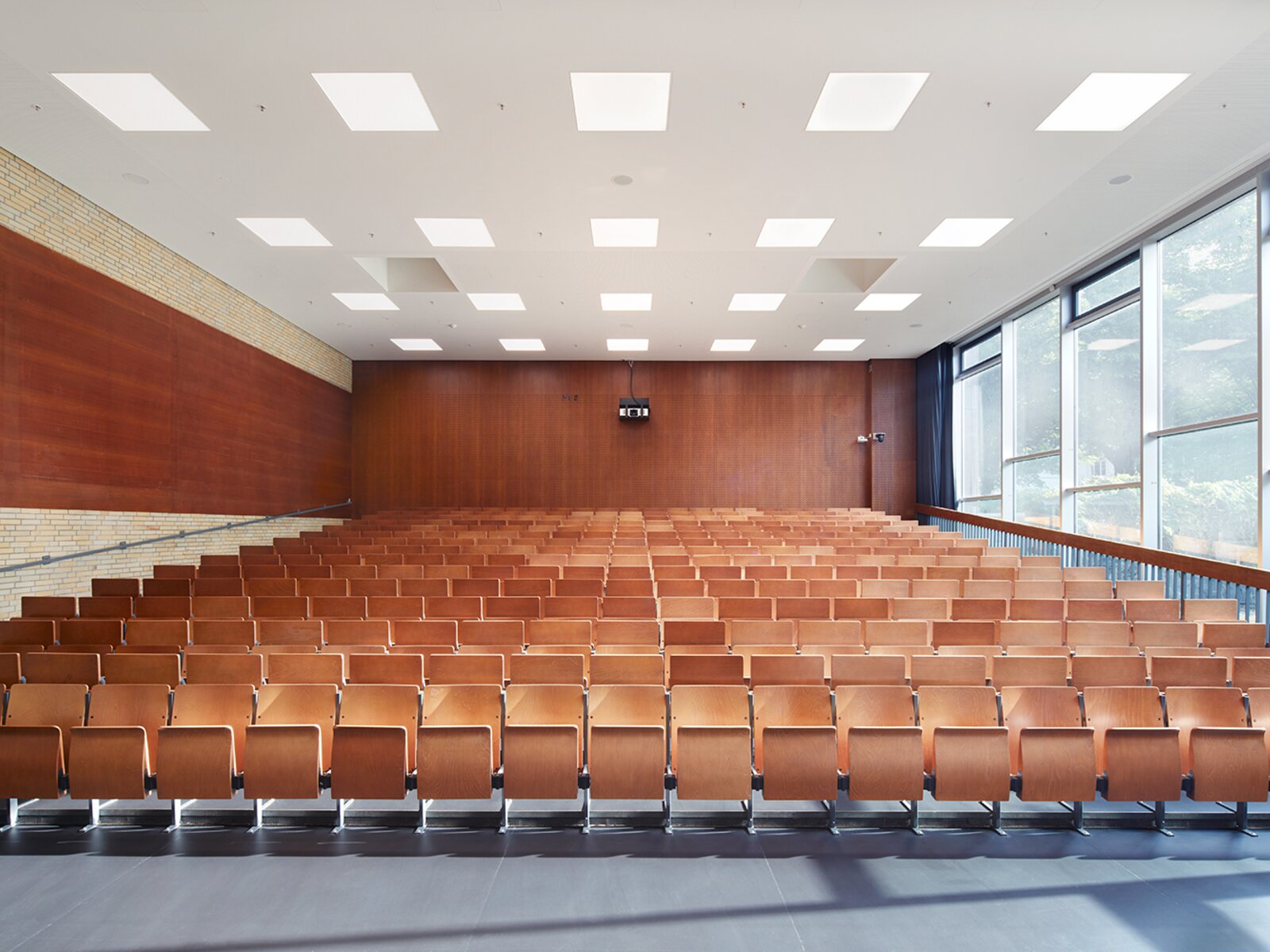 The Philosophers' Tower has a Z-shaped floor plan with four building sections and is characterised by its slender construction in the "Mid-Century Modern" style. The façade makes the building appear weightless and emphasises the vertical structures. The two wings house the faculties' seminar and student council rooms and offices. The centrepiece of the high-rise building and a major innovation is the merging of the previously separate libraries into a central library covering over 6,000 square metres, which now extends from the second to the sixth floor of the central middle building. An additional staircase and a library lift gave the library its own internal access.