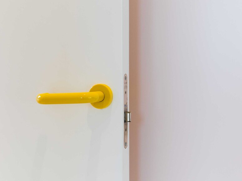 Avec la poignée de porte colorée 111, la designer de la maison témoin, Christine Leja, invite littéralement les hôtes à entrer dans les pièces et à les laisser agir sur eux. La poignée de porte apporte une touche d'élégance aux portes ce qui rend l'atmosphère de la pièce positive et joyeuse. Sa couleur se retrouve à différents endroits dans le reste de l'intérieur de la maison et crée des contrastes intéressants avec d'autres objets de décoration.