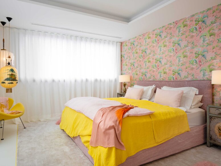 La décoration intérieure haut de gamme de la maison d'hôtes met les couleurs à l'honneur. Combiné à des idées d'aménagement minimalistes, des lignes modernes et de grandes fenêtres qui ouvrent les pièces sur l’extérieur, ce concept de décoration invite à la rêverie. La maison moderne est entourée par de grands arbres offrant une protection contre le soleil espagnol et par les eaux turquoise de la Méditerranée. La couleur du soleil se retrouve sous différentes touches dans tout le design intérieur de la maison de vacances. Que ce soit dans les tapis, les coussins, le linge de lit ou l'emblématique poignée de porte 111 HEWI dans la couleur jaune moutarde.