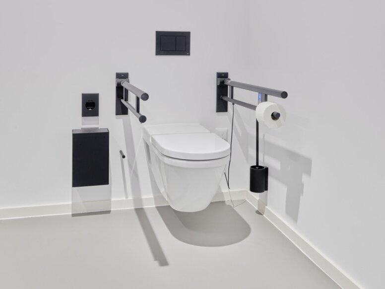 Systeem 900 van HEWI biedt een grote variatie aan naadloos combineerbare producten voor sanitaire ruimtes, ook voor de barrièrevrije toiletten bij Firner Trautwein. Net zo consequent als in de overige ruimtes komt ook hier de donkere kleurstelling van de badkameraccessoires terug.