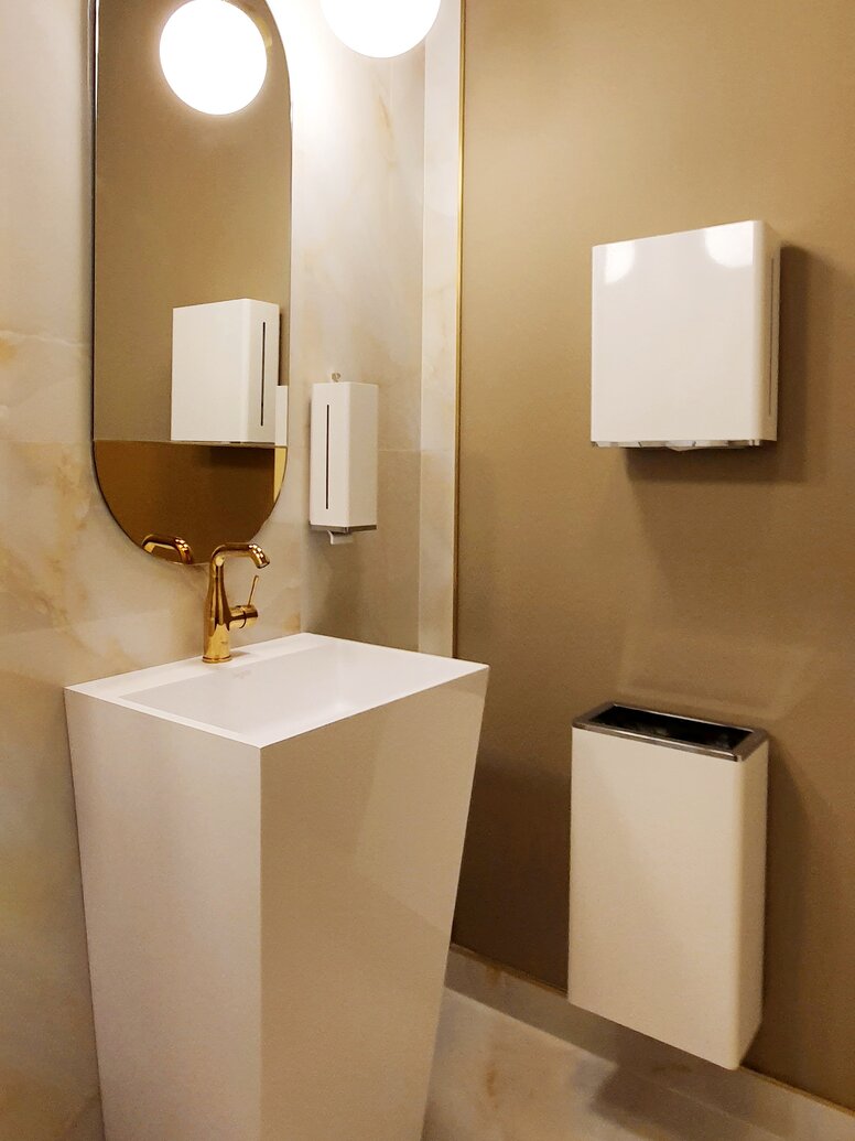 Systemy dozowników HEWI z Serii 950 uzupełniają wyposażenie sanitarne. Estetyczne systemy dozujące i pojemniki na odpadki wykonane z wysokiej jakości stali nierdzewnej pokryte białym lakierem harmonizują z rozwiązaniami bez barier.