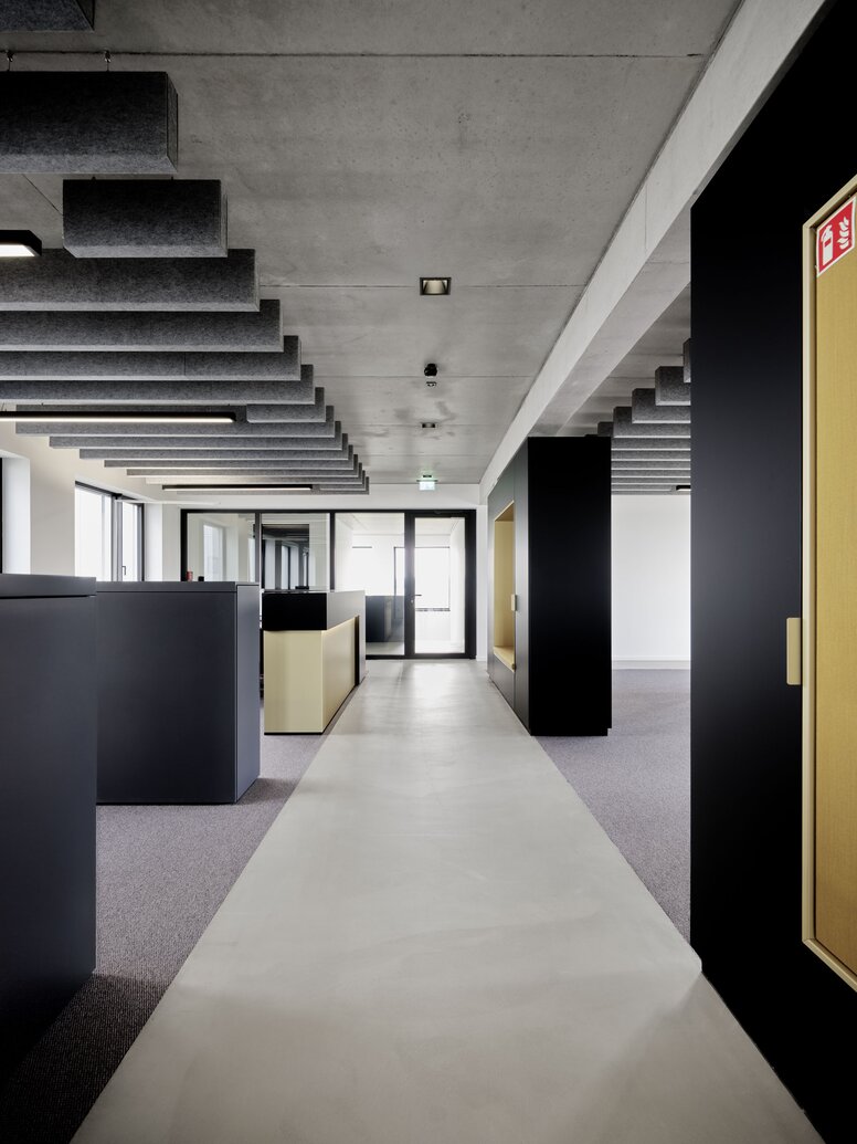 Pracownicy Firner Trautwein doceniają wysoką jakość wzornictwa swojego środowiska pracy z dużą ilością światła dziennego, czarnym kolorem, drewnem i elementami tekstylnymi w kolorze szarym.
