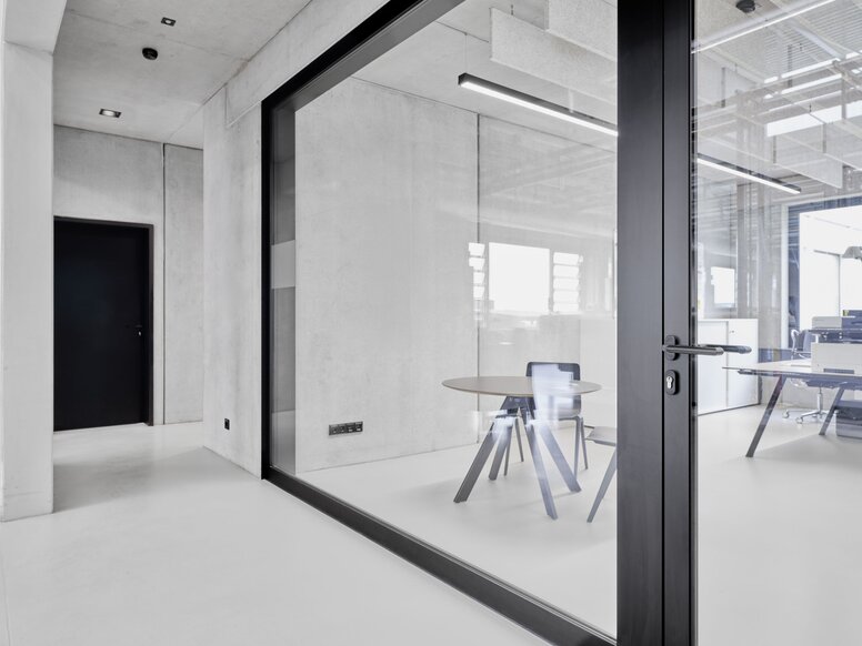 Prostą elegancję i powściągliwą harmonię powierzchni i kolorów można znaleźć w zalanej światłem części konferencyjnej administracji. Klamki okienne z systemu 162 firmy HEWI komponują się wizualnie z ramami okiennymi w tym samym kolorze: