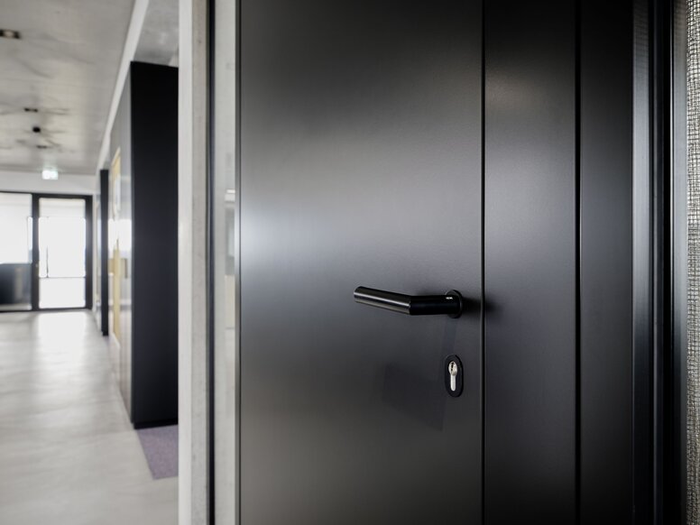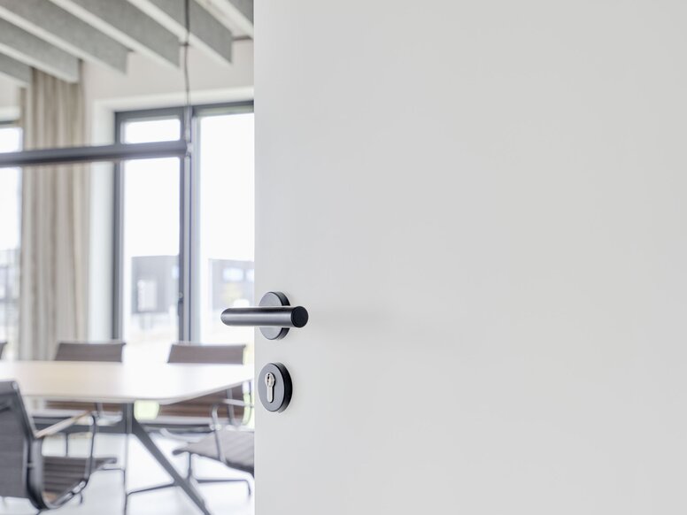 Głęboka czerń na białym tle: W budynkach administracyjnych można znaleźć tylko najciemniejszą wersję klamek drzwiowych z systemu 162 firmy HEWI.